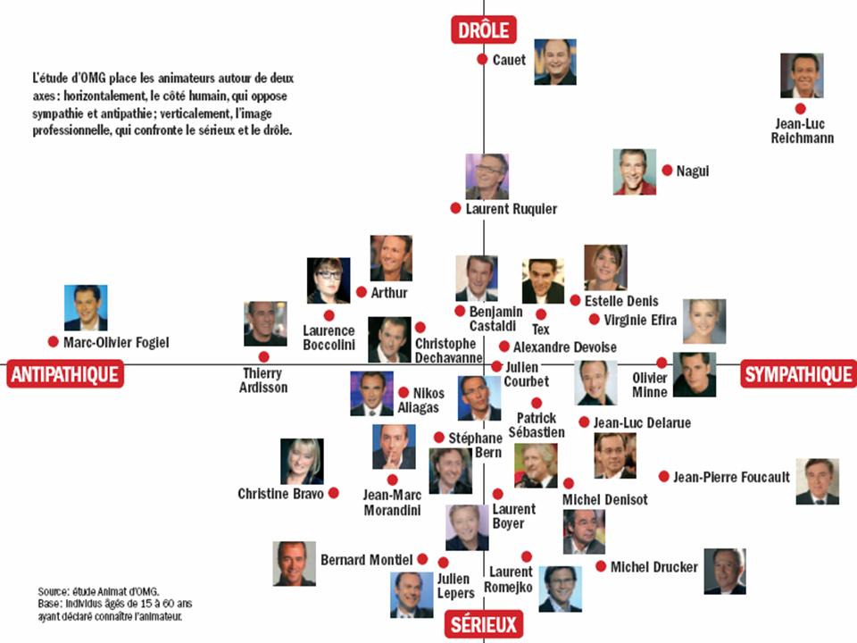 Pas beaucoup de texte, un schéma suffit à interpréter cette enquête de « Stratégies ». Les critères de détermination de la cote de popularité se détermine selon les indices suivants : Drôle, Sympathique, Sérieux, Antipathique. Première chose qui me parait étrange dans ce graphique, ce sont les thèmes de notation que je trouve très très larges et dont je ne vois absolument pas la légitimité.