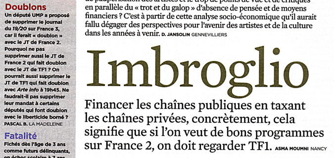 A dire que France Télévisions se rapproche d’une mort certaine, avec une Information qui va sans doute pâtir en premier des réamnéagements engendrés, il n’y a qu’un pas que je n’oserais franchir… Mais au moins, nous savons ce qu’il nous reste à faire, branchons nous sept jours sur sept sur le privé, comme cela tous ensemble, nous sauverons … Le service public ! Logique télévisuelle quand tu nous tiens…