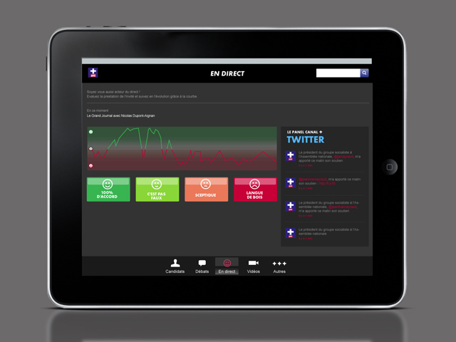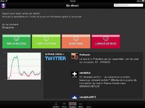 e plus en plus les chaînes de télévision prennent le virage du second écran et de l’enrichissement de l’offre télévisuelle classique. Page fan Facebook, compte twitter, séances de live tweet et encore quelques autres expériences furent testées jusque là. Cependant, Canal + a décidé de mettre en place un tout nouveau dispositif en lien avec son émission politique « Dimanche +« , la « Web-app 2012« .