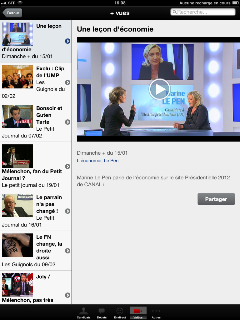 Décidément, le Groupe Canal + semble vraiment vouloir prendre cette élection à venir comme tremplin pour tester de nouvelles interactions avec le public. Après le Véritomètre lancé il y a peu en partenariat avec Owni et I>Télé, voici la « Web-app 2012« .