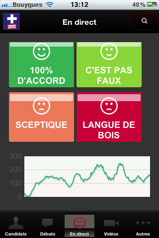 L’intérêt de cette dernière est pour une fois véritable et immédiatement quantifiable, apportant une information supplémentaire intéressante. Tandis que pour l’instant, la majorité des interactions avec un second écran se sont soldées par un apport très mince de contenu, ce service ci répond quant à lui à une vraie attente,' »Le discours politique que l’on est en train de me tenir à la télévision est-il convaincant oui ou non ?«
